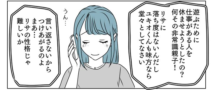 私(リサ、20代)は夫(ユキオ、30代)と3歳の娘との3人暮らし。ある日、私は義姉(夫の姉、アユミ、30代)から、発熱した甥(マイト、6歳)を預かってほしいと言われました。切羽詰まった様子だったので、夫に在宅勤務で対応してもらい、私は出社。しかし後に義母(ケイ、60代)と義姉が百貨店のセールに行っていたことがわかりました。それを知った義父(シゲル、60代)や義兄(カズアキ、30代、義姉の夫)から怒られたようで、義母と義姉は私を執拗に責めてきます。悩んだ私は母(チエ、50代)に相談することにしました。