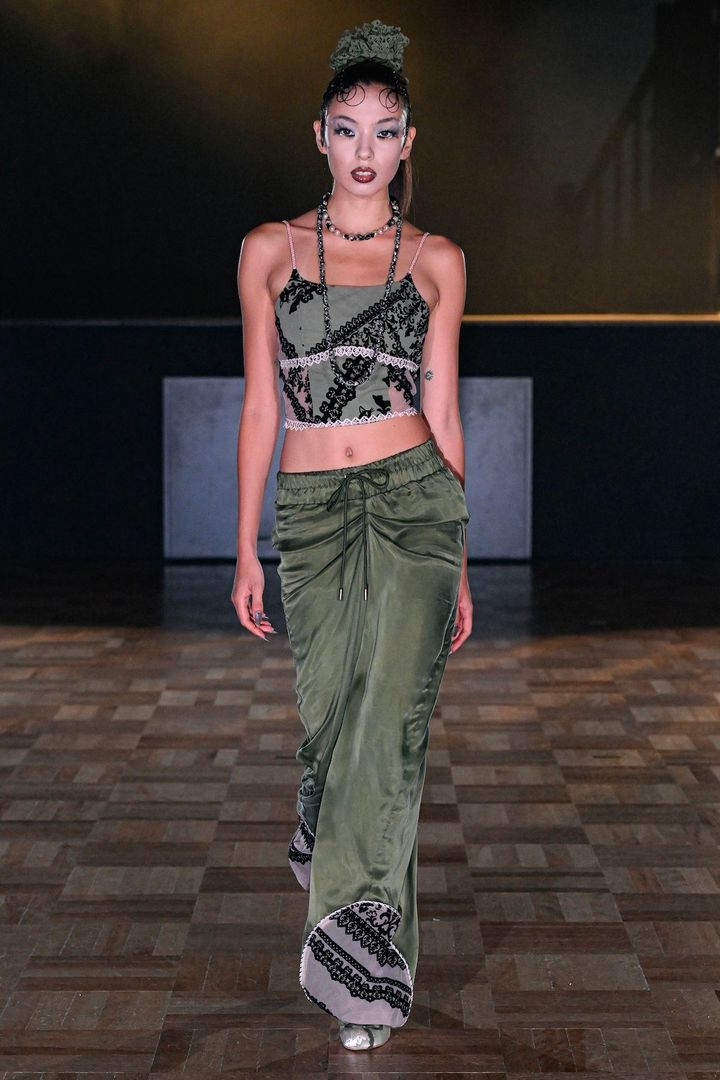 オリジナルのレースディテールには黒猫モチーフをしのばせ、アートのような視覚効果を取り入れている。このディテールはコレクション全体を通して散見され、ミリタリーテイストのワークパンツドレスランジェリールックなどと組み合わせ、独創的なひねりを加えているのが印象的だ。