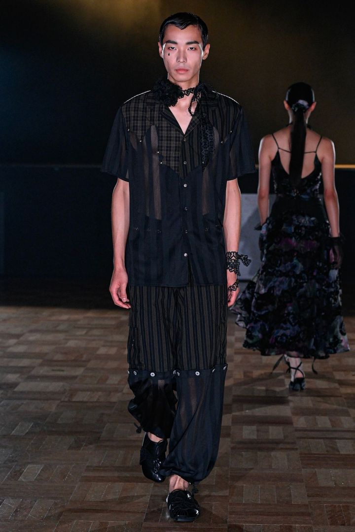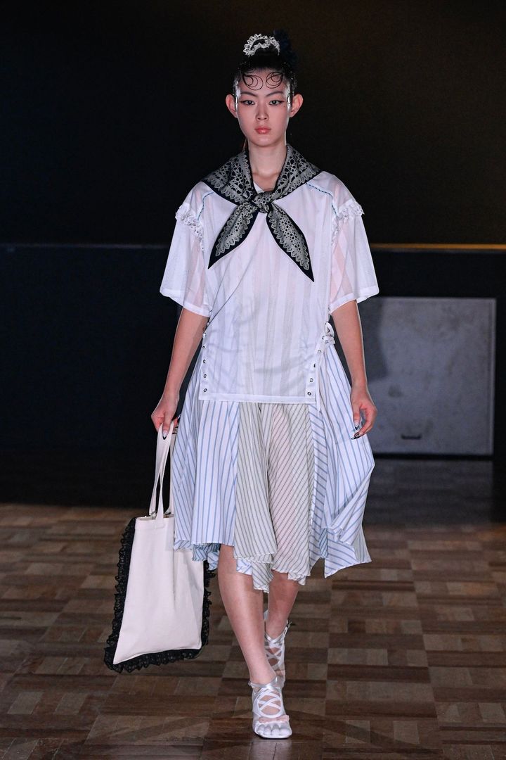 レトロな装飾が施された劇場は昭和の香りが色濃く残る。照明が落とされたステージ上に注目が集まるなか、舞台袖からモデルが登場しショーがスタートした。コレクションのシグネチャーとなるのはレースやフリル、多彩なパッチワークだ。エンブロイダリーレースを施したシアートップスは、ウエスト両サイドにリボンをあしらうことでスタイリングに奥行きを与えている。ストライプ柄のドッキングスカートは軽やかに揺れ動き、ユェチ・チが得意とする繊細な手工芸によってデコラティブなフォルムを生み出していく。