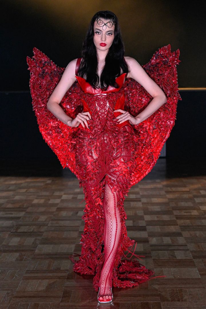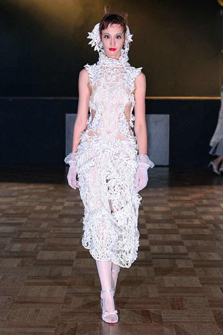 ラストを飾るのは大きな翼を背負った赤のルックだ。翼とドレスはアップサイクルレザーを使用しており、ハンドメイドでトリムして丁寧に繋ぎ合わせられている。フィナーレはモデルたちがステージ上に集合し、観客の拍手とともに幕を閉じた。ショー後、クリエイションの手応えについてデザイナーのユェチ・チに話を聞いた。「今回のショーは、平均年齢23歳という若いチームとともに創り上げました。クロシェットドレスなどはすべて手編みでつくられています。彼らのパワフルな力を実感するとともに、昔ながらの手工芸に興味を持ってもらえるきっかけになったと思います」とコメント。手工芸から生まれる独自のクリエイションはショーを重ねるごとに進化を遂げ、ファッションの可能性を切り開いていく。