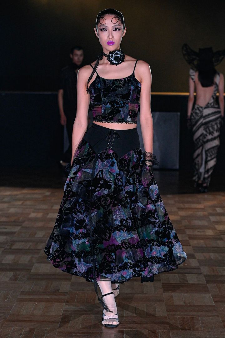 オーガンジーのスカートはフラワーパターンのレイヤリングによって歩くたびに光が反射し、妖艶な色彩を生み出している。重ねられたレースは、よく見ると黒猫とシグネチャーである「愛」のモチーフが散りばめられ、ユェチ・チらしい遊び心を感じとることができる。