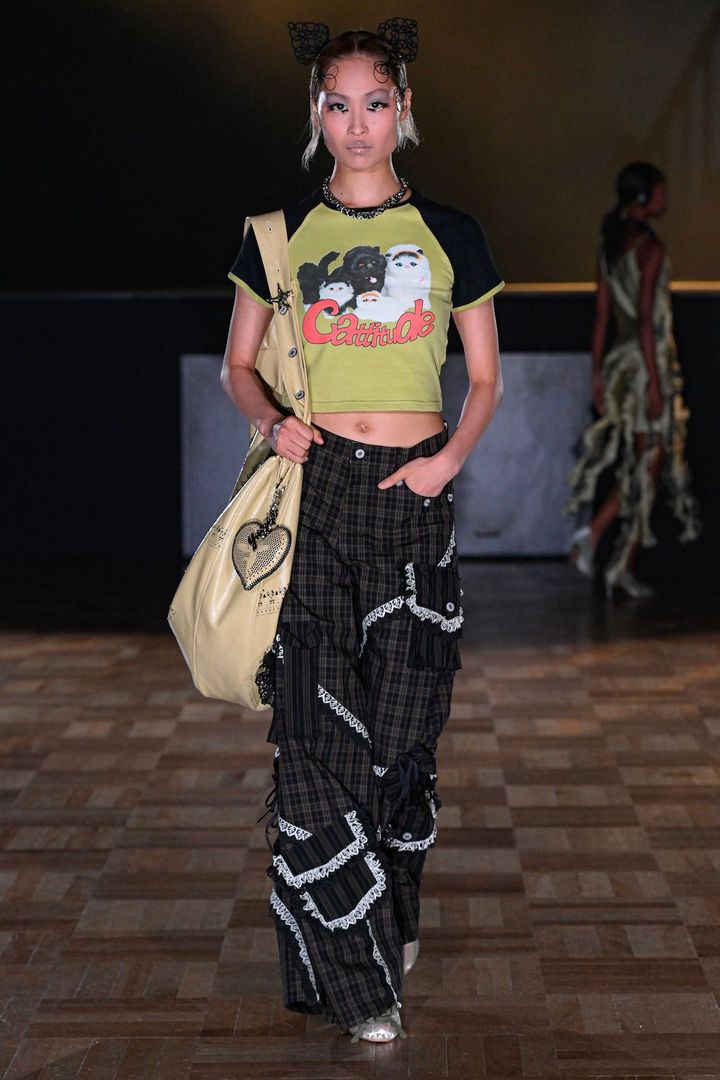 ショーの中盤では90年代を思わせるチビTも登場。愛らしい猫のプリントはユーモアたっぷりだ。カーゴパンツにはレースポケットをふんだんにあしらいガーリーなアクセントをくわえた。メイクにも注目したい。長めのつけまつ毛やグロッシーなリップなど、エッジの効いた感性で独自のゴシック要素を醸し出している。