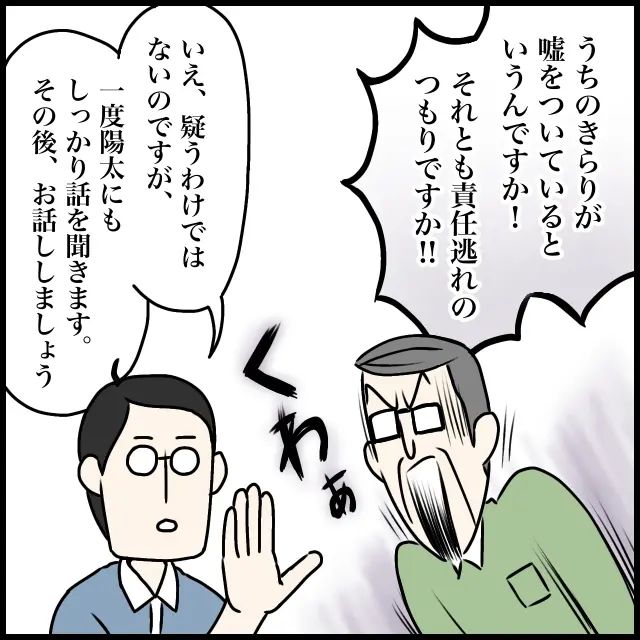 「うちのきらりが嘘をついていると言うんですか!それとも責任逃れのつもりですか!!」と常に戦闘態勢のきらりパパ。「いえ、疑うわけではないのですが、一度陽太にもしっかり話を聞きます。その後、お話ししましょう」夫が冷静に言いました。