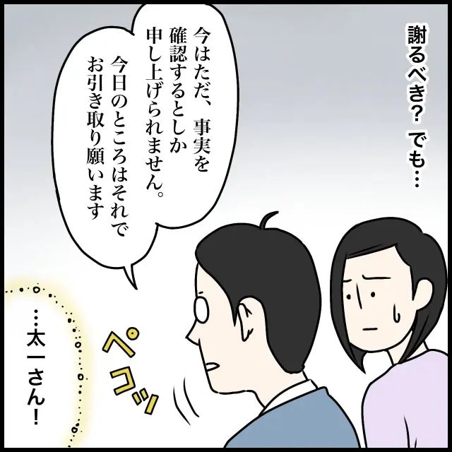 「今はただ、事実を確認するとしか申し上げられません。今日のところはそれでお引き取り願います」終始冷静な夫の態度に、「・・太一さん!」と心の中で尊敬の眼差しを送りました。