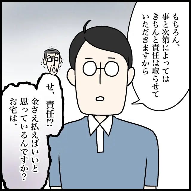 そして、「もちろん、事と次第によってはきちんと責任は取らせていただきますから」夫がそう言うと、「せ、責任!?金さえ払えばいいと思っているんですか?お宅は」体を震わせながらそう言うきらりパパを見て、