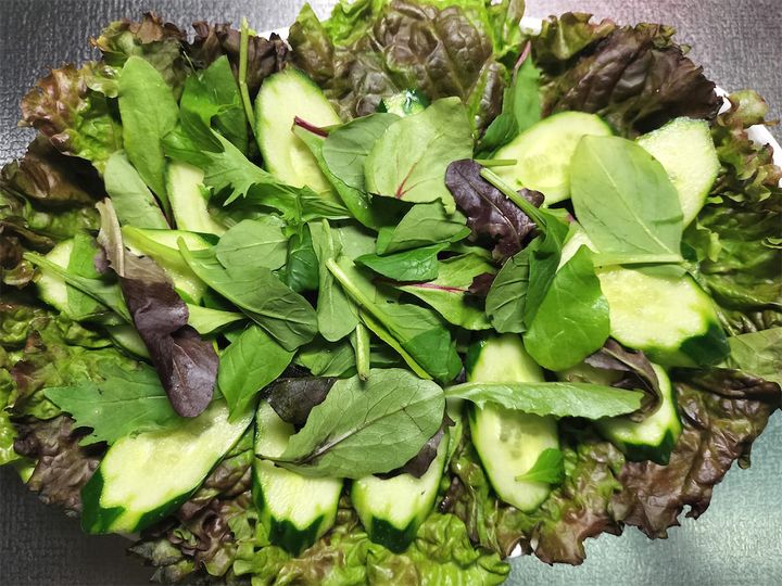 3. 器にサニーレタス、ベビーリーフ、きゅうりを盛りつけます。