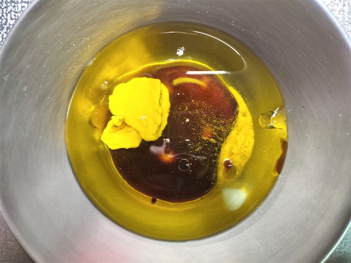 2. ボウルにマスタード、リンゴ酢、バルサミコ酢、塩、こしょう、オリーブオイル、サラダ油を入れて混ぜます。