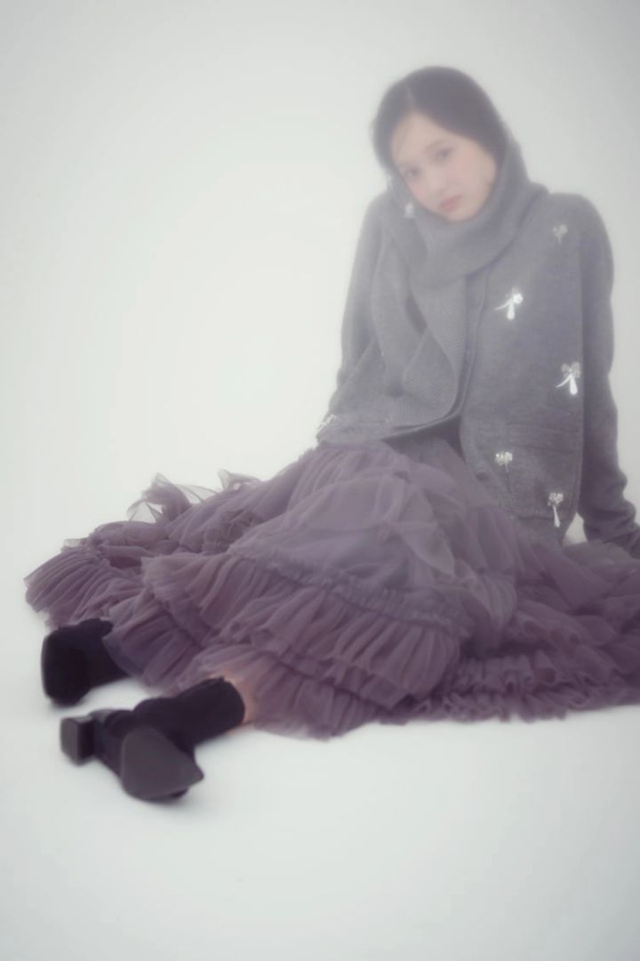 スパンコールニットとチュールスカートの映え×映えなコーディネートは、ダークトーンで引き締め。あちこちに散りばめられたリボンデザインが可愛い♡