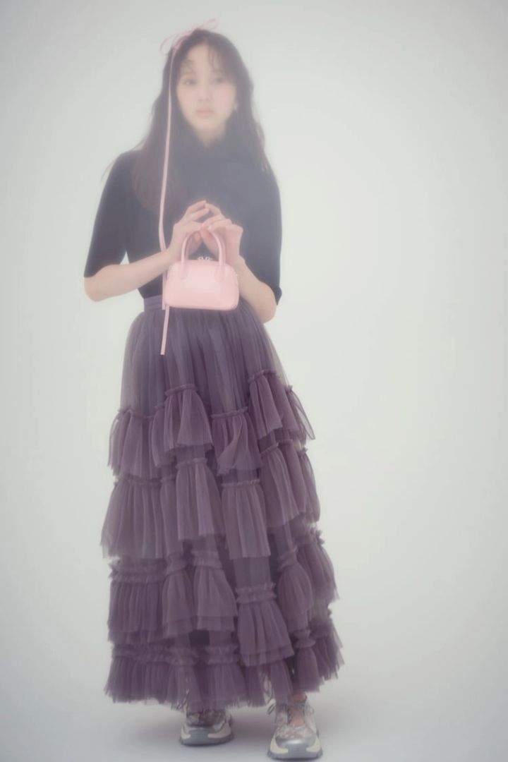 グレーシフォンティアードスカート 16,940円/RANDA 黒チュールリブニットトップス 9,790円/être loin イヤリング 4,860円/アビステ バッグ 13,320円/ALKI ALKA(HANA KOREA)フラワービジュースニーカー 15,950円/RANDA ヘアリボン/スタイリスト私物