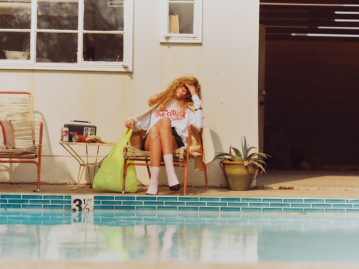 アーティなレタリングのややかすれた赤は、1枚でヴィンテージライクなムードを引き連れるとともに、適度な量の差し色としても有効。青でもグリーンでもなく赤だから、レディな服装とぶつけてもケンカしない。白の長そでならバングルもしっかり主張し、ゴールドのキレイさを拾い上げてくれる。