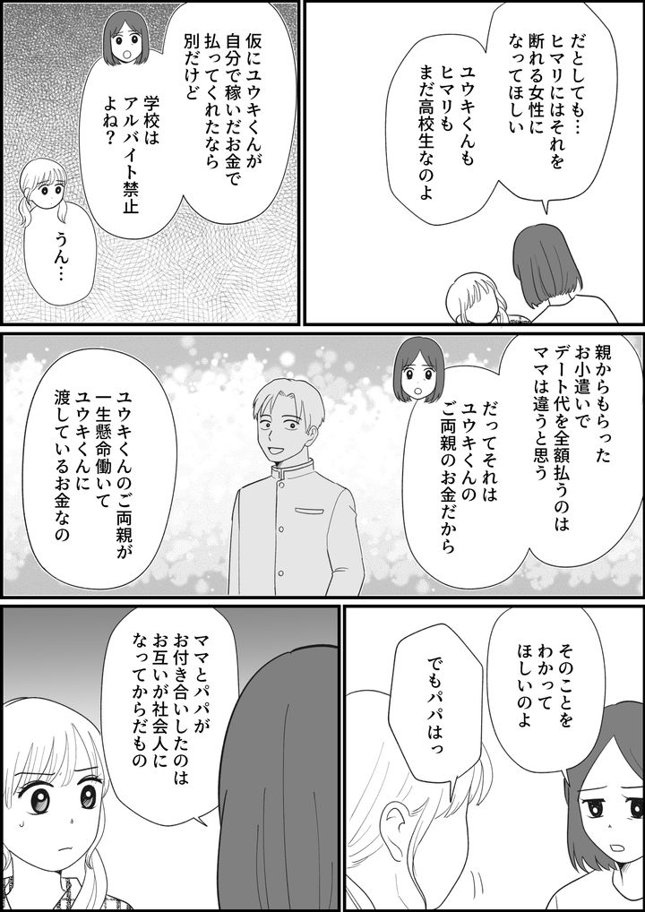 私(ヒマリ)はパパとママと3人暮らしです。昨年の秋から、同級生のユウキと付き合っています。ユウキはサッカー部に入っていて土日も試合や練習のことが多く、まだ初デートには至っていません。でもユウキは部活を頑張っているし、わがままは言わずに応援していました。高校2年生になって、ようやく時間が合った私たちは念願の初デート! しかもユウキが全部奢ってくれたのです。楽しくて、嬉しくて、私がウキウキで家に帰ると、ママが「次回から割り勘にしなさい」って怒ってくるのでした。もーーーー! せっかくの楽しい気持ちが台無しです!!!
