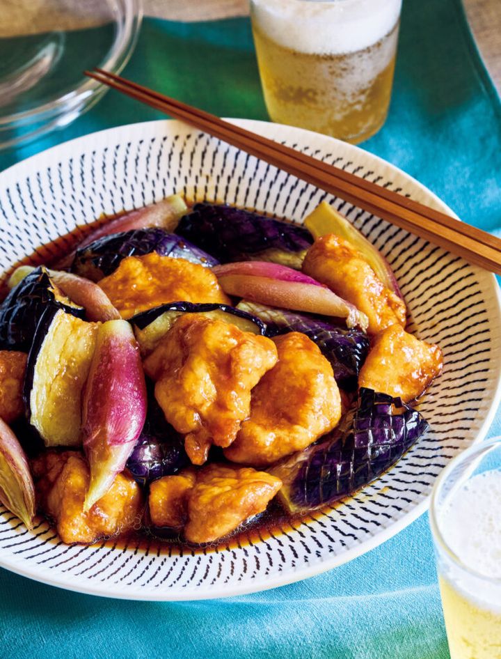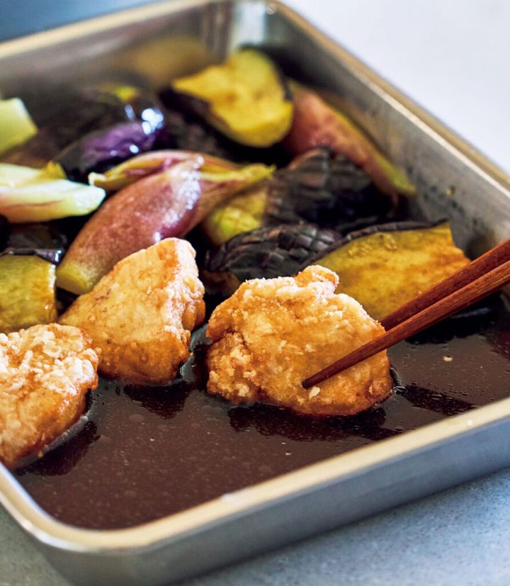 ジューシーな鶏むねととろけるなすに、黒酢のまろやかな酸味がじゅわっとしみ込む「揚げびたし」。