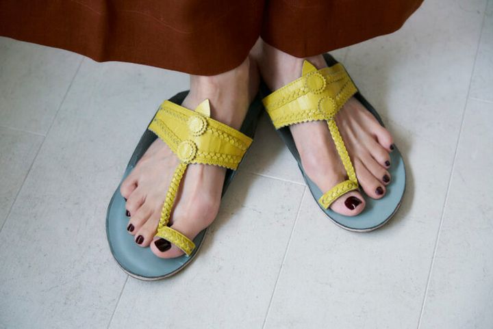 インドの街を歩くと、すれ違う人たちのほとんどがはいているというのが、「ザ・ソールシスターズ」のトングサンダル。「ソールとアッパーのカラーをオーダーできるのですが、靴底が硬くて。このままではアスファルト舗装された銀座の街は歩けないので、クッションを入れたヴァージョンをオーダーしました」(土村さん)。ブルー×イエローのカラーが、ダークレッドのネイルにもぴったりです。