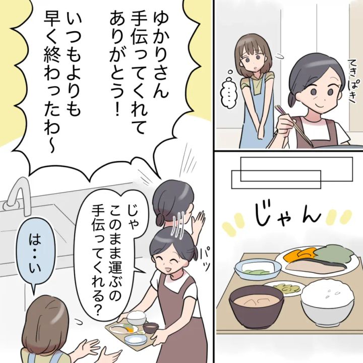 何をしてよいか分からず立っている私のそばで、義母はてきぱきと食事の準備を終わらせました。そしてまたみんなに聞こえるように大きな声で「ゆかりさん手伝ってくれてありがとう!いつもよりも早く終ったわ~」と言いました。いえ、私何もしていません。それでも「じゃ、このまま運ぶの手伝ってくれる?」と義母に言われるがまま、私は義母の作った料理を運びました。