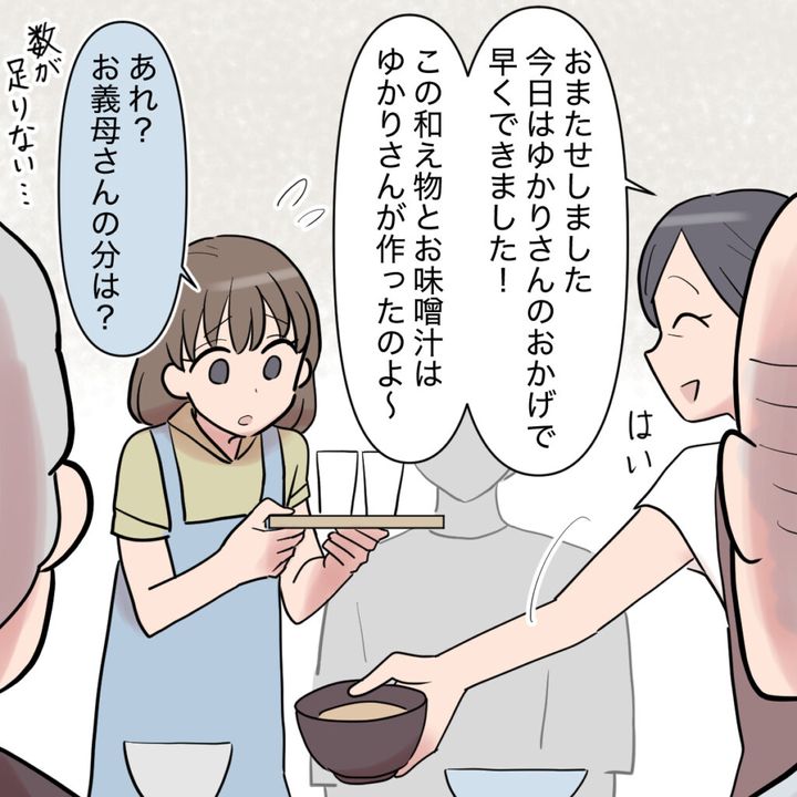 義母は義母父母と義父が座る食卓に作ったものを並べながら、「お待たせしました。今日はゆかりさんのおかげで早くできました!この和え物ととお味噌汁はゆかりさんが作ったのよ~」と嘘ばかり・・・。私も並べるのを手伝いながら、義母の食事は運ばれていないことに気付きました。