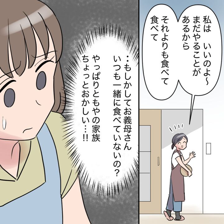 「私はいいのよ~。まだやることがあるから。それよりも食べて食べて。」と笑顔で言うと、忙しそうに台所へ戻って行ってしまいました。その慣れた様子を見て、私はもしかして義母はいつも一緒に食べていないの?と疑問に思いました。お邪魔してからずっと思っていたけれど、ともやの家族、やっぱりちょっとおかしい!私のモヤモヤは確信に変わりました。