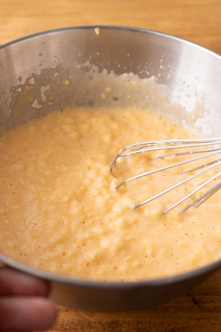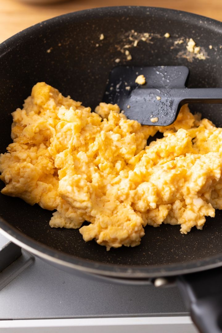 2、フライパンにサラダ油を熱し、卵液を流し入れて混ぜながら炒める。