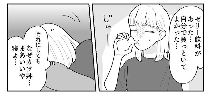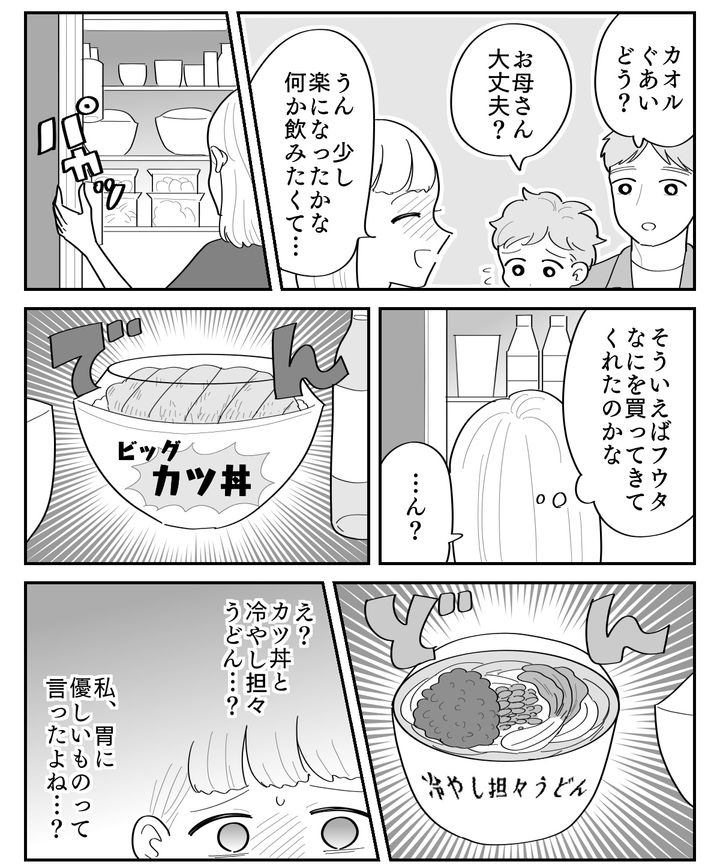 フウタが心配して「何か買ってくる」と言ってくれたので、食べやすそうなあっさりしたものを期待していました。しかし冷蔵庫にはなぜかボリューム満点のカツ丼と冷やし担々うどんが鎮座していたのです。これを私に食べさせようと思ってるの……!? なぜこのメニューになったのか、まったく理解ができません。