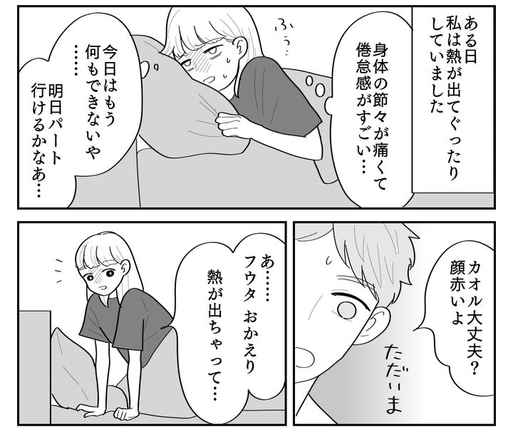 私はカオル。夫のフウタ、小2の息子・コウヘイと3人で暮らしています。今日は朝からめずらしく熱を出してしまって、コウヘイを学校へ送り出した後に病院へ行ってきました。その後も身体が重くてだるくて、横になって過ごしています。夕飯を作る気力もないのでフウタに連絡したところ「なるべく早く帰るよ」と返信してくれました。学校から帰宅したコウヘイには「お母さんは具合が悪いから寝ているね」と伝え、フウタの帰りを待っていたのですが……。