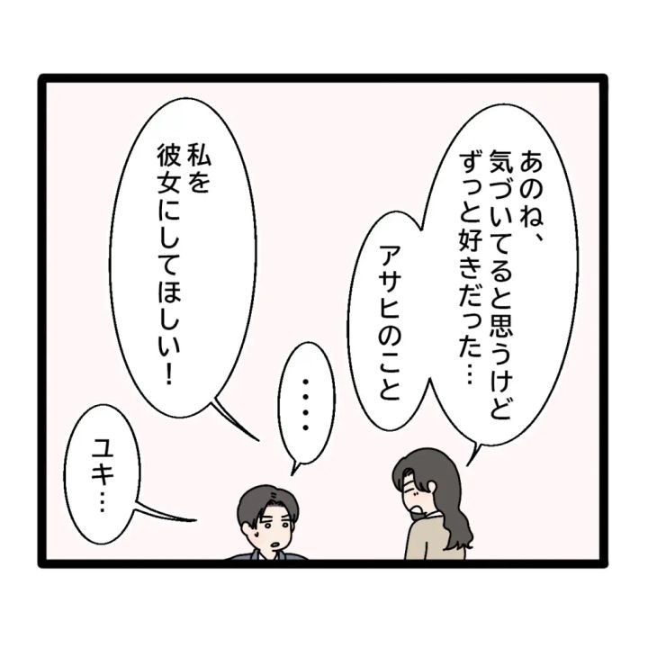 私は「あのね、気づいてると思うけど、ずっと好きだった・・アサヒのこと」と勇気を出して告白しました。驚いた表情で黙るアサヒに「私を彼女にしてほしい!」と言うと、アサヒはちょっと困ったように「ユキ・・」と言いました。