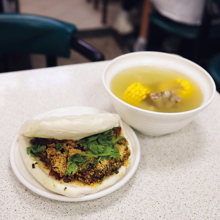 脂身と赤身が半分ずつの割包70元。玉米排骨湯85元とともに。