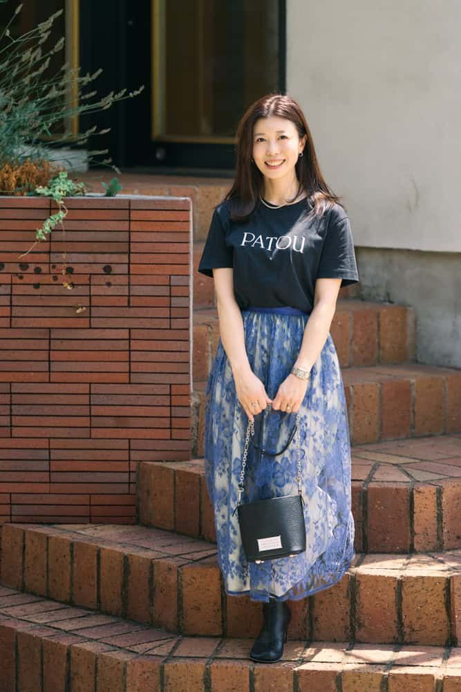 PATOUのTシャツは生地感がさらっとしていてきれいめに着られるので、カジュアルなアイテムと合わせても子どもっぽくならないのが魅力。夏はカゴバッグやリネン、ホワイト系のアイテムと合わせて軽やかに。秋はレザー小物を取り入れ、テイストミックスで大人っぽいスタイリングを楽しみたいです。