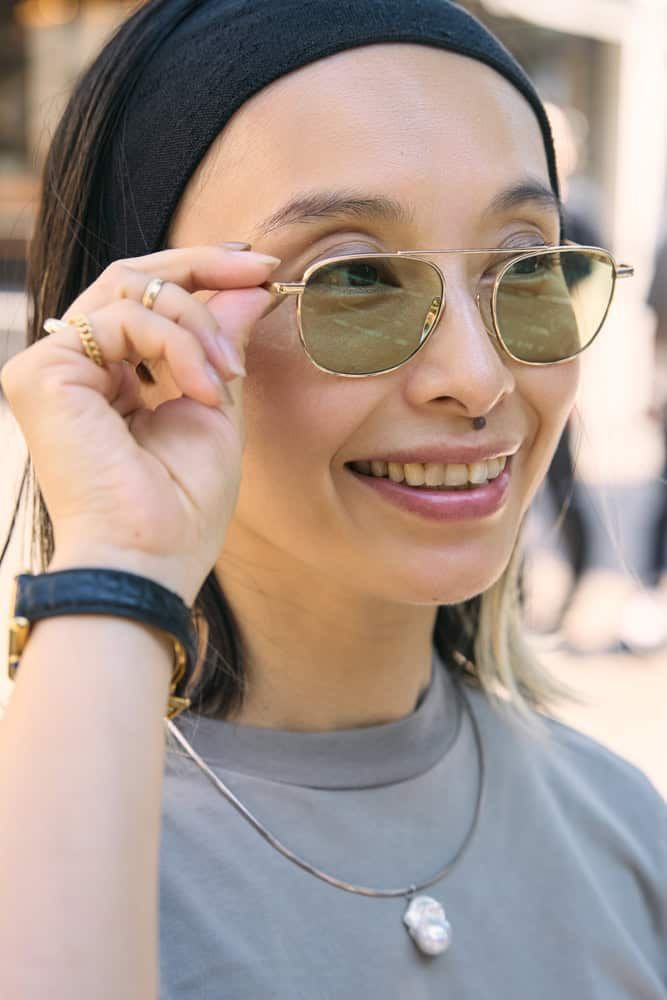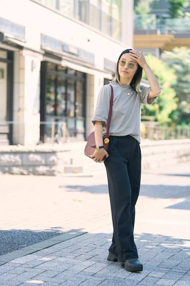 グレージュのTシャツに同系色のサングラスやバーガンディのバッグなど、シックな色で秋気分を取り入れました。Tシャツもパンツもシンプルな分、たっぷり重ねづけしたアクセサリーなどの小物をアクセントにして、シルエットのバランスが取れるようコーディネート。特にサングラスは、かけるだけで様になるのでTシャツコーデの日に頼れるアイテムです。