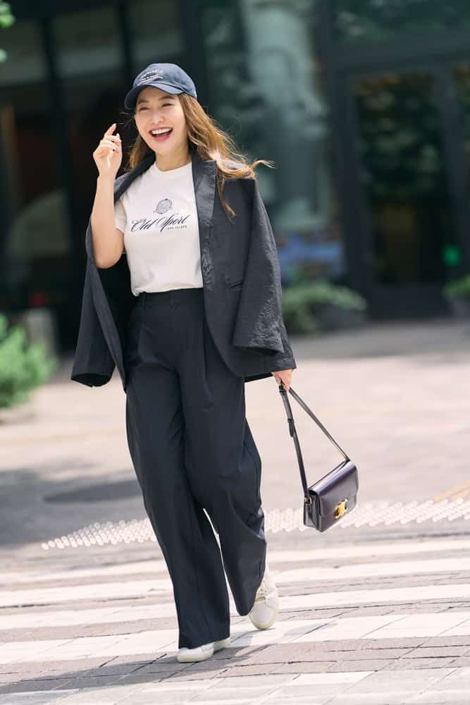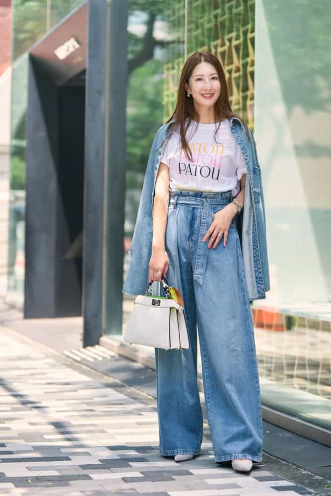 真夏にはスカート合わせで涼しく着ることが多かったロゴTシャツ。秋の気配を感じる頃には、デニムのセットアップと合わせて旬な着こなしを楽しみたいです。キレイ色のロゴが華やかなポイントになってくれるので、デニム上下でもボーイッシュになり過ぎず、大人かわいく仕上がります。ホワイトのバッグでコーデに軽やかさをプラスしつつ、ネオンカラーをリフレインさせたのがポイント!