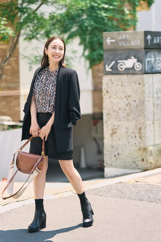 肩の控えめなフリル使いが気に入っている柄Tシャツは、夏は白ショーパンやデニムでカジュアルに着ていましたが、秋になっても活躍してくれる1枚。今日は黒を合わせて大人っぽい雰囲気に。ジャケットを羽織ってショートブーツで重さをプラスすれば、秋っぽいコーディネートが完成します。ブラウンレザーのバッグは、Tシャツの柄と色を合わせて統一感を出しました。