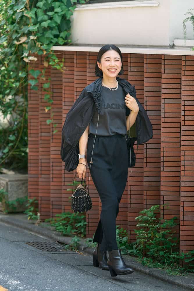 夏はホワイトのボトムやカゴバッグなど、重くならない色合わせで着ていた黒Tシャツ。秋はオールブラックコーデで楽しみたい。秋とはいえまだ暑さが残るため、小物から季節感をシフトします。足元はサンダルからショートブーツへ。スエードのバッグやデザイン性のあるアウターを羽織り、アクセサリーはアクセントになるようメリハリを効かせます。