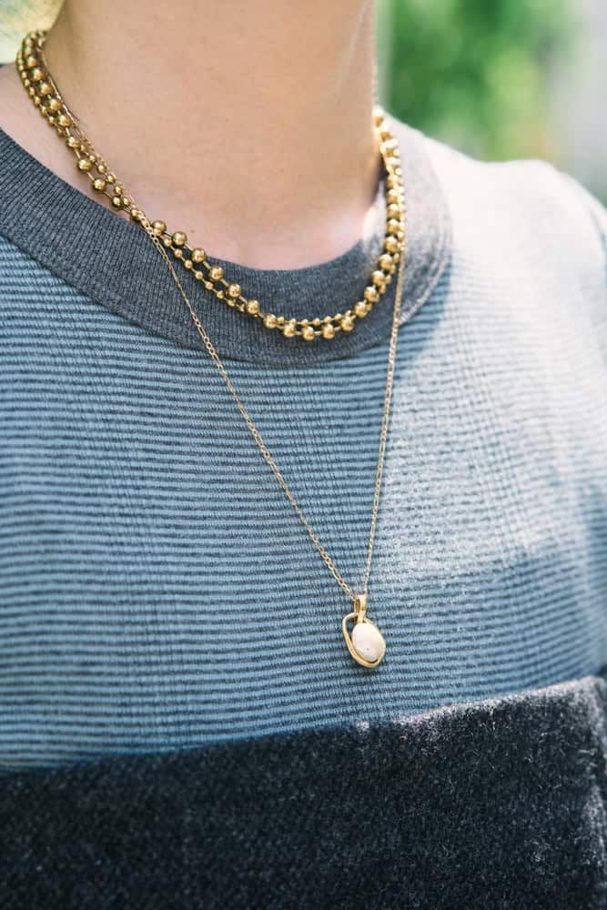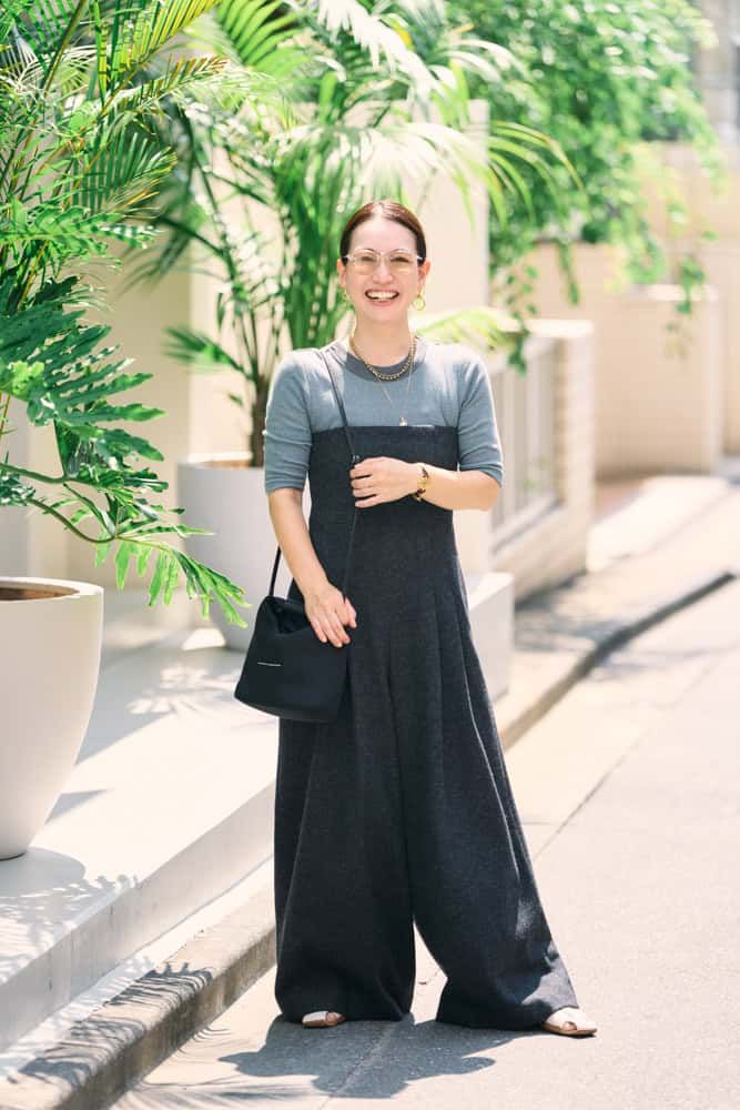 5分袖Tシャツは、肩と二の腕をしっかり隠してくれ、自分でデザインしたお気に入りの一枚。秋らしい生地感のオールインワンと合わせることで、季節感を感じられるワントーンコーデに仕上げました。アイテムがシンプルなので、アクセサリーは淡水パールのネックレスを中心にゴールドの重ねづけでコーデにアクセントを!