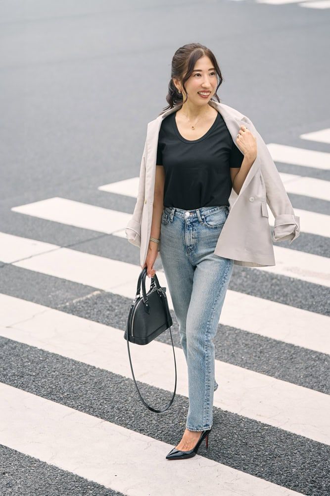 シルエットとUネックのラインがきれいで気に入っているTシャツは、シルクのような質感がカジュアルスタイルを上品に仕上げてくれます。夏はサンダル合わせでしたが、足元をパンプスに変え、ジャケットをプラスすることで、秋らしさを感じられるようなコーデにしました。Tシャツに合わせてバッグと靴も黒でまとめ、全体に統一感を出しています。