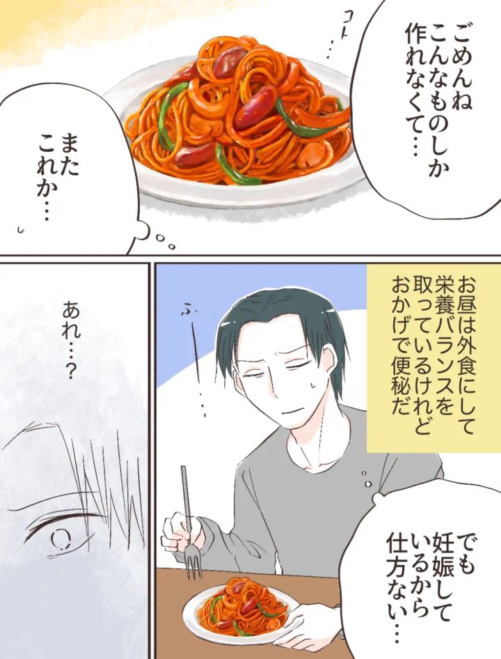 「ごめんね。こんなものしか作れなくて・・」とナポリタンを作って出すハズキさんの言葉に、「またこれか・・」と心の中で呟くリヒトさんは、「お昼は外食にして栄養バランスをとっているけれど、おかげで便秘だ」と心の中で思いながら、「でも妊娠しているから仕方ない・・」と自分に言い聞かせていました。そしてふと、「あれ・・?」と思い立ったリヒトさん。