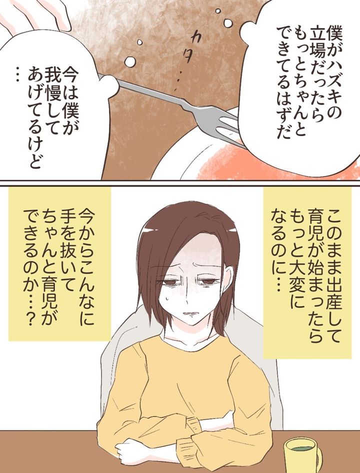 「僕がハズキの立場だったら、もっとちゃんとできてるはずだ。今は僕が我慢してあげてるけど・・」そして、「このまま出産して育児が始まったらもっと大変になるのに・・今からこんなに手を抜いてちゃんと育児ができるのか・・?」