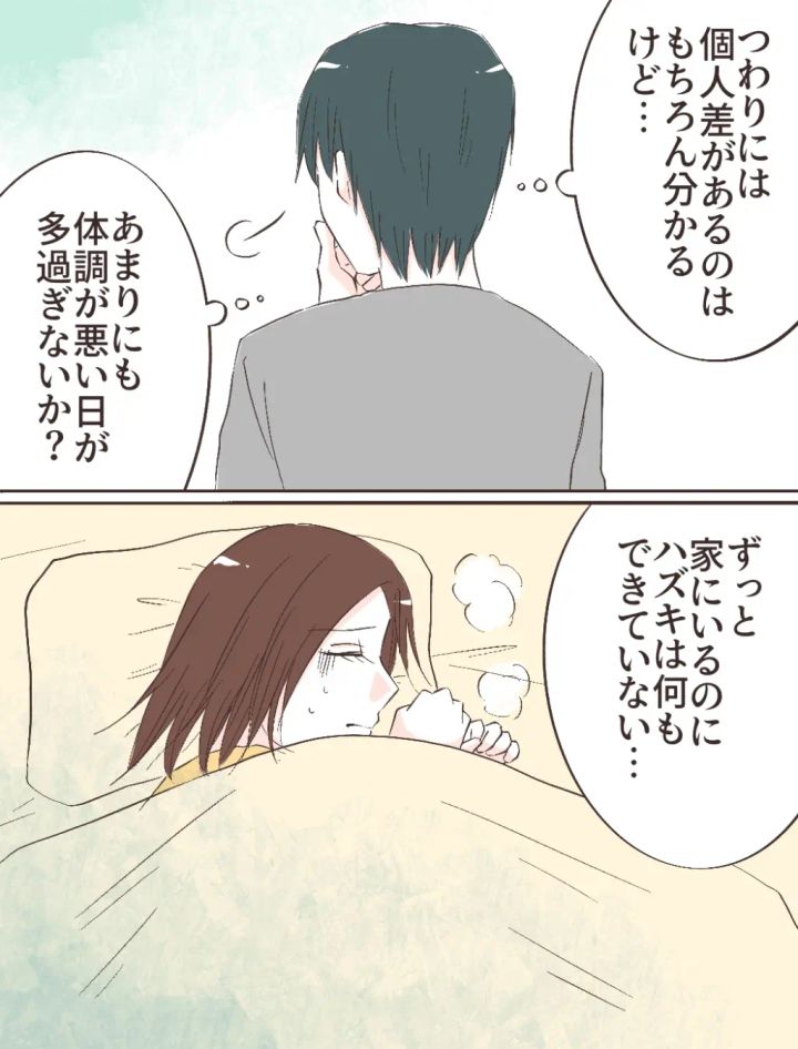 「つわりには個人差があるのはもちろん分かるけど・・あまりにも体調が悪い日が多すぎないか?」そう思った後、「ずっと家にいるのに、ハズキは何もできていない・・」とため息をつきました。