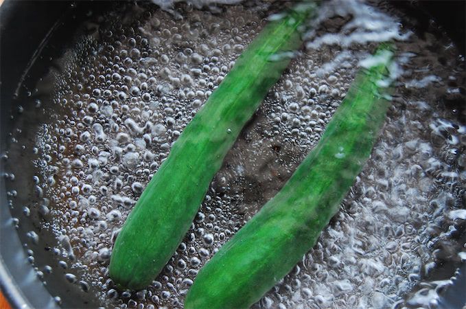 沸騰したらきゅうりを投入し、20秒ほど茹で、流水で冷まします。茹ですぎるとパリッとした食感がなくなるのでご注意を。