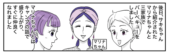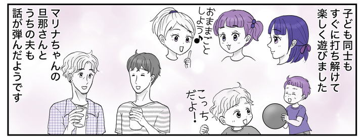 マリナちゃんは美人で気さくな人。キャンプの話で盛り上がった私たちは一気に仲良くなりました。子ども同士もすぐに打ち解けて、楽しそうに遊んでいます。マリナちゃんの旦那さんは穏やかな人で、うちの夫と会話が弾み、いい雰囲気の集まりになりました。