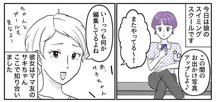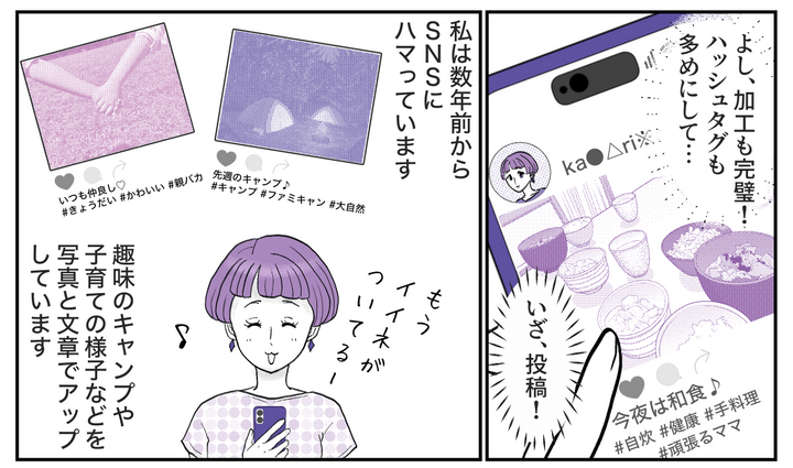 私(カオリ)は専業主婦。夫のタツヤと、幼稚園に通う娘と息子との4人暮らしです。私はもともとSNSに疎かったのですが、少し前にスイミングスクールのママ友・サキちゃんが簡単にできると教えてくれました。一度やり始めるとあっという間に夢中になった私。近頃は自分でも積極的に投稿する日々です。画像を加工したり切り取ったり、ハッシュタグをつけたりと一生懸命に工夫して……。私の投稿に「いいね」がつくと最高の気分です!