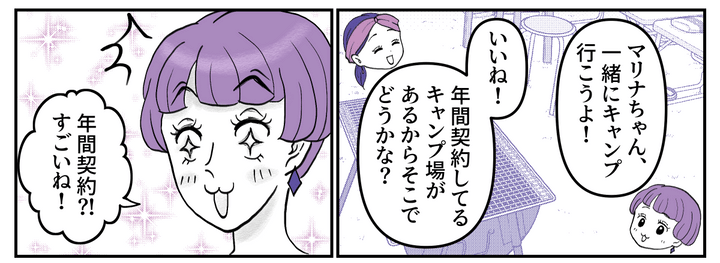 そして話の流れで、今度マリナちゃん一家と我が家が一緒にキャンプへ行くことになったのです。しかも年間契約しているキャンプ場があるのだとか! 新たなキャンプ仲間との出会いに気分が上がります。