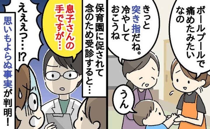 ボールプールで遊んでいる際中、手を痛めた5歳の息子。突き指をしたのだろうと、その後、看護師である実母にアイシングをしてもらいました。しかし、保育園の先生に促されて病院を受診したら、思いもよらぬ診断結果を告げられたのです……!