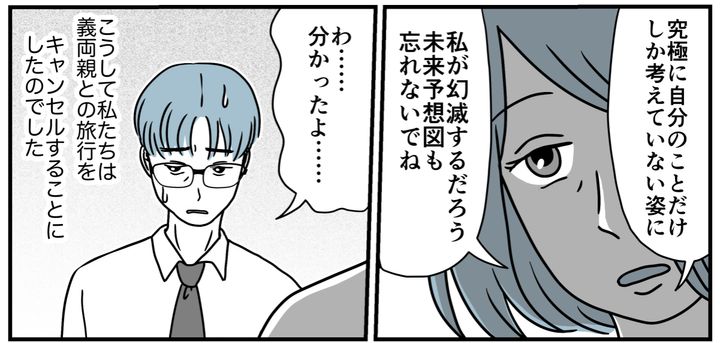 だったら義兄夫婦を何とかすればいい話であって、一方的に私に我慢してほしいと頼み込んでくるのは違うと思うのです。義兄は絶対に折れないだろうし、義父は一緒に行けると信じています。義母だって夫だって、あの横暴な義兄をなんとかできる感じではありません。私だって宿泊の権利を手放すのは悔しいけれど、泣く泣くキャンセルすることを決めたのでした。