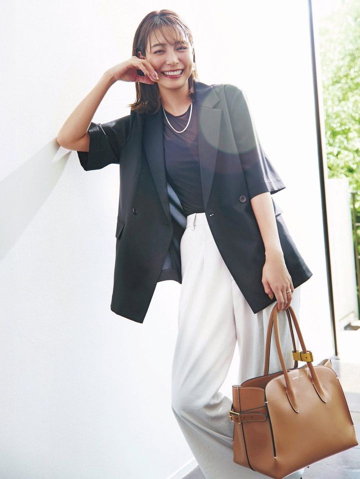 ジャケット¥13,990(アンフィーロ〈オンワード樫山〉)トップス¥11,000(スピード/ゴールドウイン カスタマーサービスセンター)パンツ¥16,500(ノーク)バッグ¥195,800〈ザンケッティ〉リング¥18,700〈ニナ・エ・ジュール〉(ともにショールーム ロイト)ネックレス¥26,400(リューク)ピアス¥19,800(ワンエーアールバイウノアエレ/ウノアエレ ジャパン)