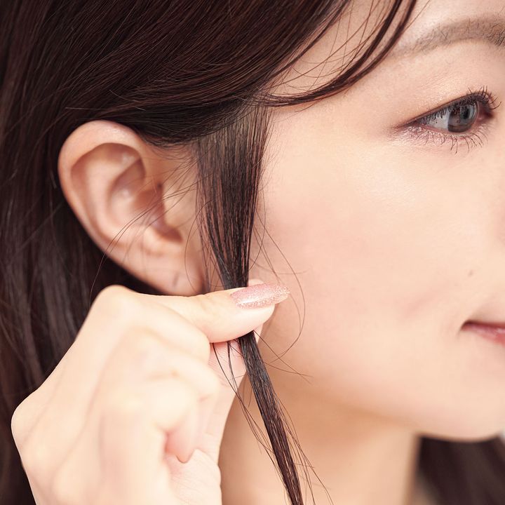 髪全体にオイルを軽くつけ、おろしているサイドの髪を耳にかけたら、もみあげあたりの毛をひとつまみ出します。これで洗練度が高まります。