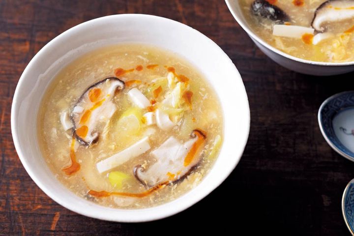 ❷鍋に【A】を入れて中火にかけ、煮立ったら①を加えて3分ほど煮る。白こしょうを振り、水とき片栗粉を加えてとろみをつける。卵をときほぐして回し入れ、卵がふんわりと浮いてきたら火を止める。