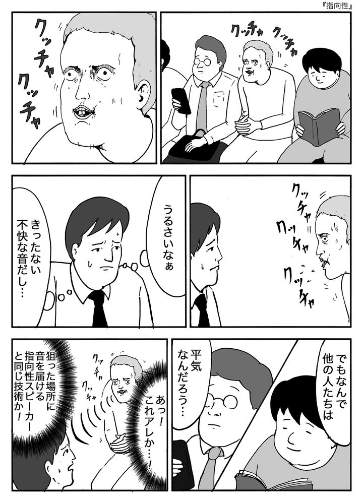 不思議に思った主人公は、ふとした拍子にその理由に気づきます。実は男性は、特定の方向だけに音を届ける“指向性スピーカー”と同じ原理を使い、主人公にだけクチャクチャ音を集中していたのです。その場に居合わせてしまった主人公は、まるで狙い撃ちされたように逃げ場がありません。