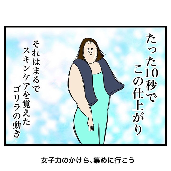 髪を乾かそうとパウダールームに入ったノンノさん。周囲の女性たちは、ひとつひとつの動作をとても丁寧に、しっかりとスキンケアをしている様子。そんな中で、ノンノさんはロッカーの前で“バババババ”と、なんと10秒ほどでお手入れを終えてしまったのだとか。この様子に、まるでスキンケアを覚えたゴリラのようだと自らツッコミを入れ、「女子力をもっと高めよう」と心に決めるのでした。