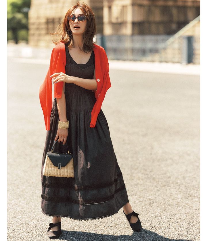 キャップ¥8,250(ザ シンゾーン/シンゾーン ルミネ有楽町店)肩に巻いたカーディガン¥14,300(セルフォード/セルフォード ルミネ新宿2店)ワンピース¥24,200(メゾンスペシャル/メゾンスペシャル 青山店)タンクトップ¥13,200(ティッカ)バッグ¥145,200(ピエール アルディ/ピエール アルディ 東京)サンダル¥17,600(メリッサ/メリッサ シューズ ジャパン)ピアス¥8,800(ゴールデン モンステラ/H 3Oファッションビュロー)ブレスレット¥25,300(ワンエーアールバイウノアエレ/ウノアエレ ジャパン)