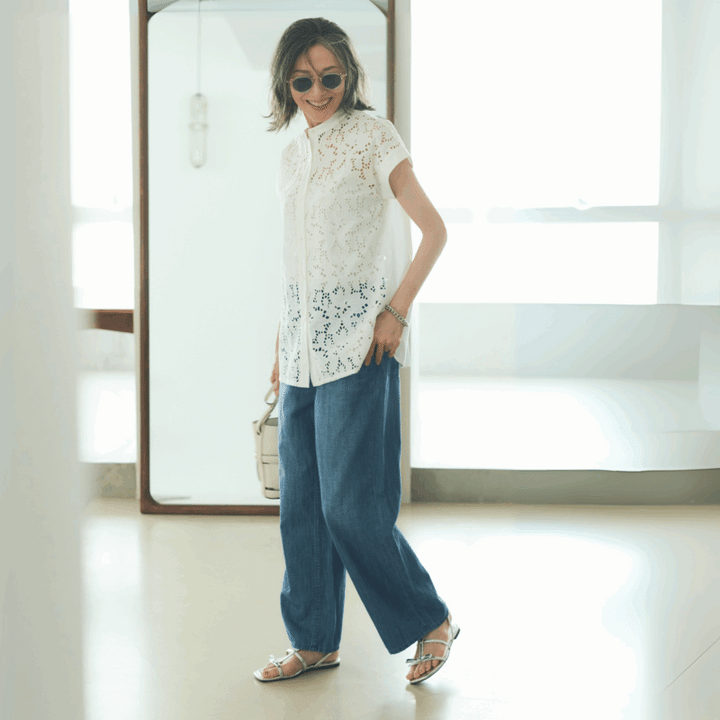 デニムパンツ¥17,600/ヘルシーデニム(ゲストリスト)、ブラウス¥8,789/ドゥクラッセ、バッグ¥48,400/オルセット(オルサ)、サングラス¥50,600/アイヴァン(アイヴァン 東京ギャラリー)、イヤリング¥11,000、ブレスレット¥11,000/ともにアビステ、 サンダル¥8,990/プラステ、インナー/スタイリスト私物