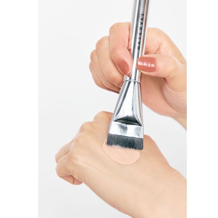 毛穴落ちした部分のメイクを取り去ったら、下地とファンデーションを手の甲で混ぜたものをブラシに取り、オフした部分に塗り直します。
