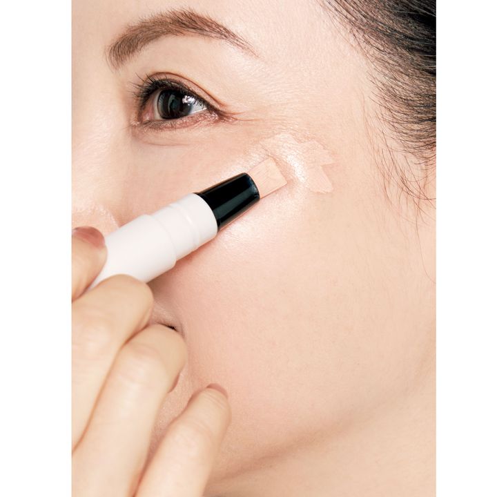 浮き上がってきたシミ部分を拭い取り、ブラシタイプのコンシーラーでバツ印をつけたらスポンジで優しく馴染ませて。